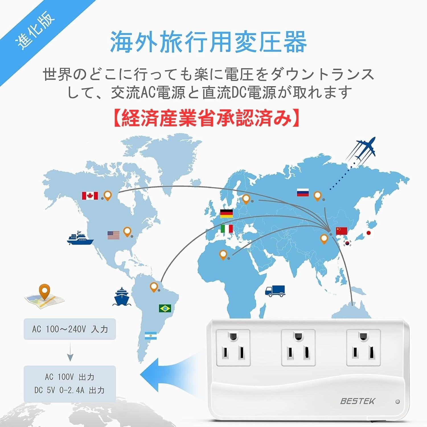 海外用変圧器 - 【経済産業省承認済み】の海外旅行用変圧器です。海外コンセントの240v・230v・220vから100vにダウントランスして日本仕様の電圧に変換できるので、海外用変圧コンセントとして海外旅行でも日本の家電製品が使えます