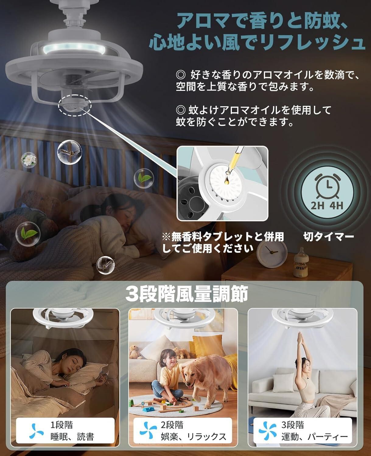 【一台三役・光&風一体化・省エネ】LEDシーリングファンライトは「ファン」と「LEDライト」を一体化した製品です。天井から部屋の隅々まで新鮮な空気を届けるだけでなく、心を落ち着かせるそよ風と優しい光をもたらす!お部屋の空気をしっかり循環し、温度差を解消する同時、居心地の良い雰囲気を作り出す快適に。ライトだけ作動モード、ファンだけ作動モード、ファン・ライトを同時に作動モード3段階調整、一台三役を実現!ニーズに応じて調整し、不必要なエネルギーの浪費を抑え、電気代 約70% 削減でより省エネ! LEDシーリングファンライト:AC100V /150W相当 ミニ寸法:約Φ28*18cm 重量:663g 素材:高品質ABS+PC 使用寿命:50000H 操作方法:リモコン操作 LED全光束:約4000LM 風量:150W相当超高速風速 低騒音:≤45dB LED照明角度:180°広角 3色温:3500k-6500k 調光調色:無階段調整可能 タイマー機能:2・4H