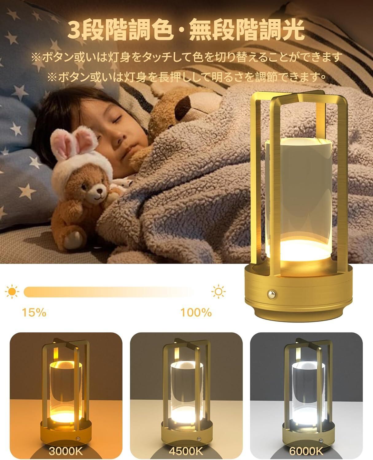 【3色切替・無段階調光】このテーブルランプは、ランタンの柔らかなフォルムと自然光からインスパイアされ、新たに開発された製品です。オレンジ色の暖かい光から電球色への無段階調光が可能で、明るさと色合いを自由に調整できます。タッチ制御により、本体に触れるだけで「昼白色」→「白暖色」→「電球色」→「消灯」の順に簡単に切り替えができ、長押しすると自動的に輝度が変化します。
