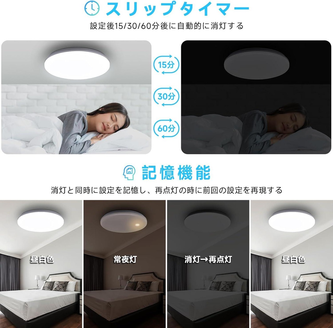 【メモリ機能】・ON/OFFタイマー、リモコンでライトの明るさと色温度を調節し、30秒後に記憶されます。次回点灯時に記憶されたパターンから点灯しますご注意:メモリ機能はリモコンで設定すること。リモコンには15分/30分/60分後の自動消灯の設定ができます。独立制御の豆電球常夜灯付き、低消費電力の常夜灯は夜間の睡眠や高齢者のケアに最適です。