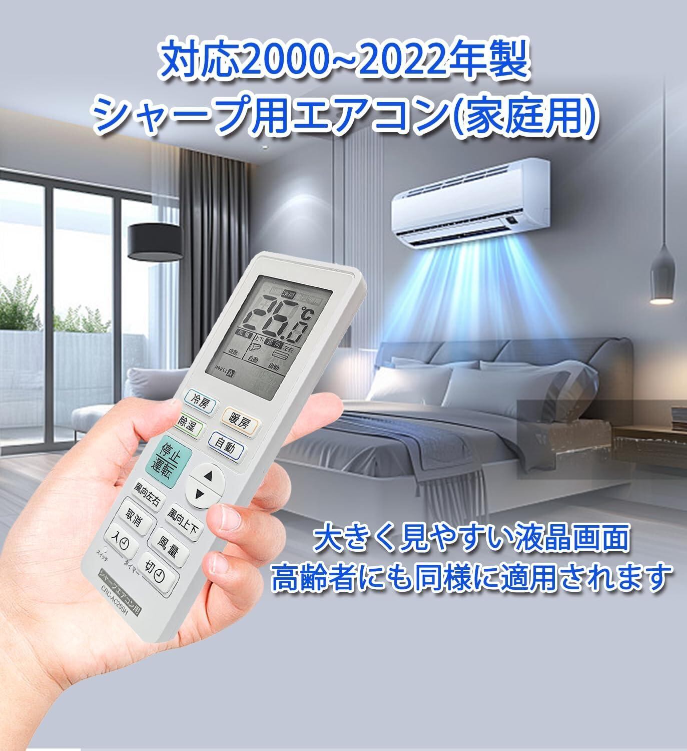 【設定なしですぐに使えます】シャープSharp エアコン汎用リモコン。2000年から2022年までのシャープ家庭用エアコンに対応しており、エアコンのモデルを選択する必要はなく、生産年に応じて対応するブランドのエアコン用リモコンを選ぶだけです。