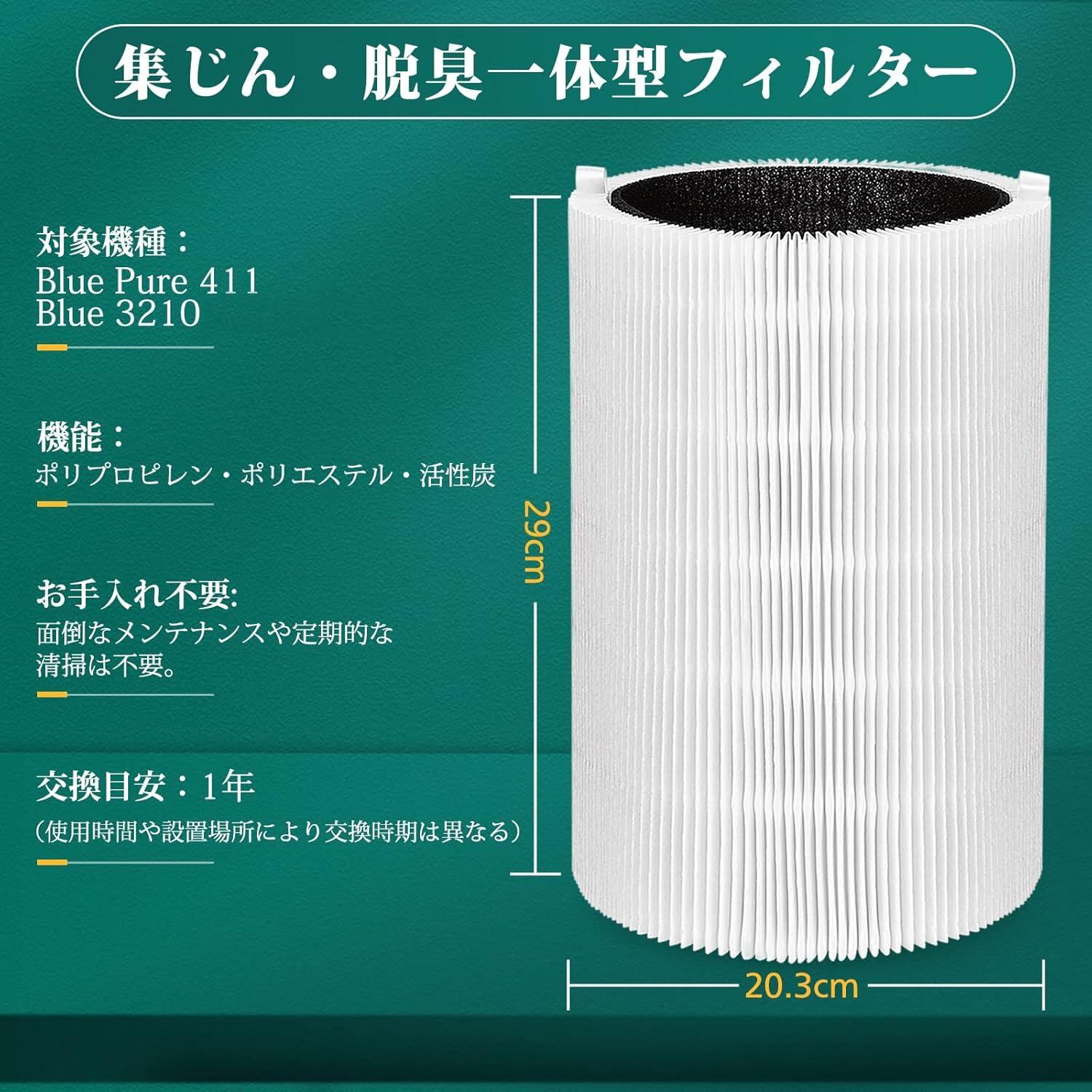 【適応機種】空気清浄機のBlue Pure 411とBlue 3210。※対応機種をお確かめの上、ご注文ください 。対応品番:100929と品番:106488 。 素材:ポリプロピレン、ポリエチレン、活性炭 。