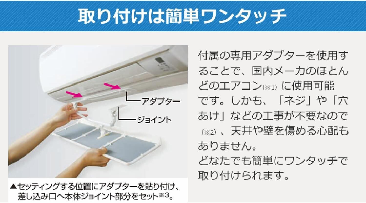 エアコンの風よけ「エアーウィング」でエアコンの直撃風を緩和し、身体の冷え、目・喉・お肌の乾燥を防ぎましょう。工具不要で簡単にお取り付けできます。万が一の落下防止のため、セキュリティキットが付属されておりますので、安心安全にお使いいただけます。