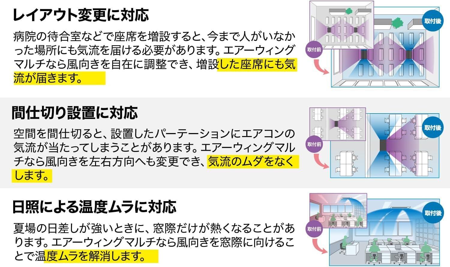 従来のエアーウィングは上下に風を流すことに特化しておりましたが、こちらの「エアーウィング マルチ」は上下左右に風を流すことができます。空調の位置を気にせず、自由にお部屋をレイアウトすることが可能です。