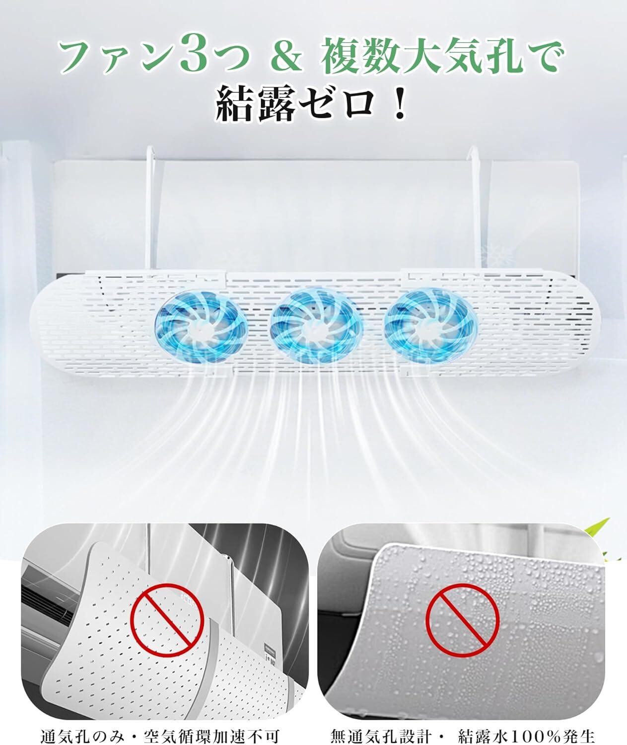 【結露防止・防カビ】3つのファン+複数通気孔を備えたエアコン風よけが冷気流を分散し、結露の発生を99%以上抑制。カビ繁殖を防ぎ、清潔な空気を維持します。