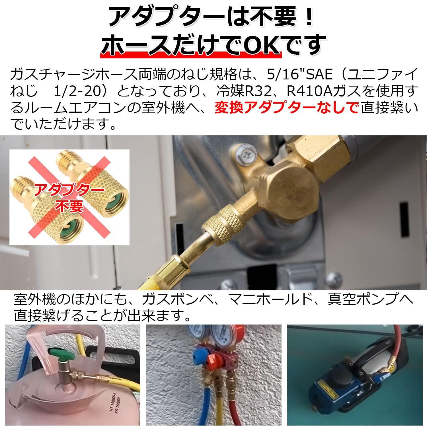 チャージホース両端のアダプタが5/16"SAEであり、R410A,R32冷媒対応のエアコンの室外機に変換アダプタなしで接続できます。