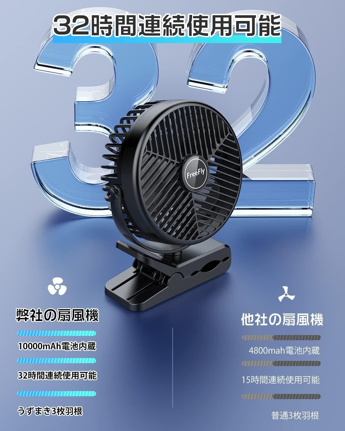 【10000mAh電池内蔵】FreeFly 充電式クリップ扇風機 卓上扇風機 直径約10CM羽根 14cm大型ファン搭載 風量3段階調整 Type-C・USB-A端子搭載 スマート急速充電対応 360