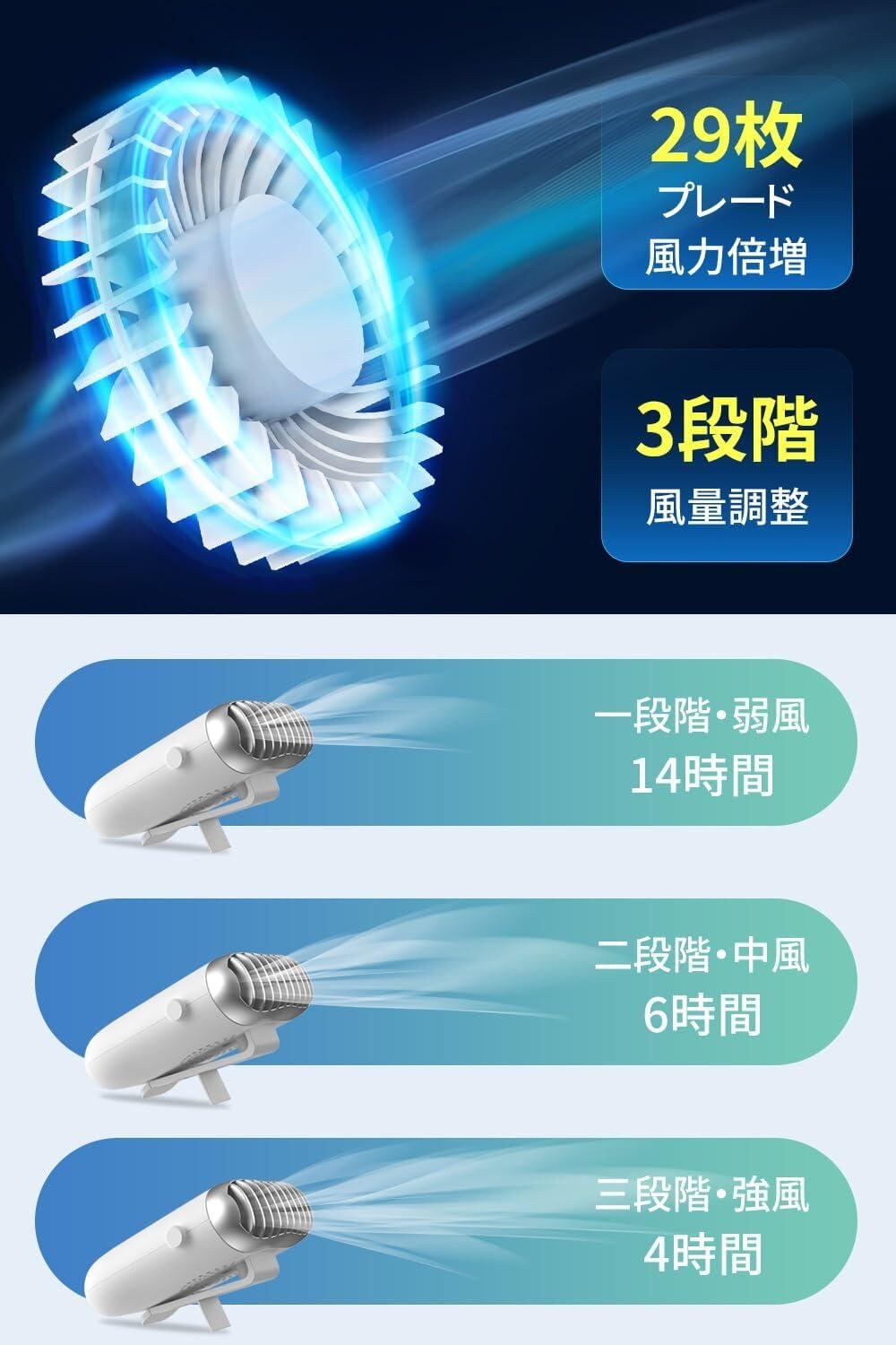 ️ 【大容量バッテリー搭載・最长14時間稼働】 4800mAh超大容量バッテリー:フル充電後、約14時間弱風モード時の連続使用が可能。 ⚡ USB充電対応:パソコン・アダプター・モバイルバッテリーで簡単充電。外出先でも安心使用! ※ 実際の稼働時間は使用環境により異なる場合があります。