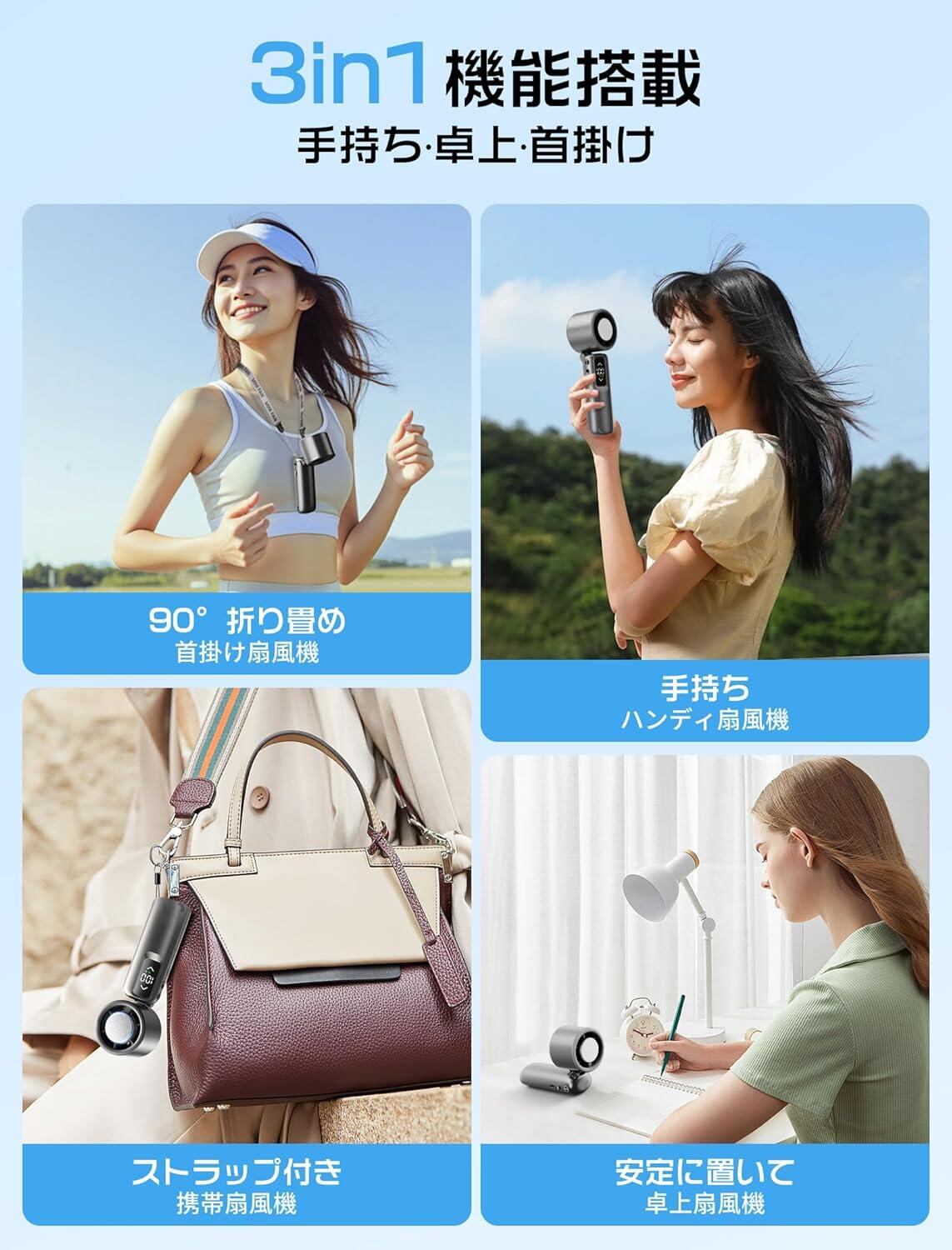 【静音設計 ·熱中症対策に最適】長寿命で運転音が静かなDCブラシレスモーターを採用、動作音が小さく省エネにもなります。スマホよりも軽い約250gで、バッグに入れて持ち運びも簡単です。 いつでもどこでも使用できます。真夏のフェスやアウトドア、スポーツ観戦、散歩、山登り、遠足、お祭りや日常生活でのガーデニング、お化粧時、家事の時、通勤、通学、オフィスなどあらゆる場面で活躍するアイテムです。