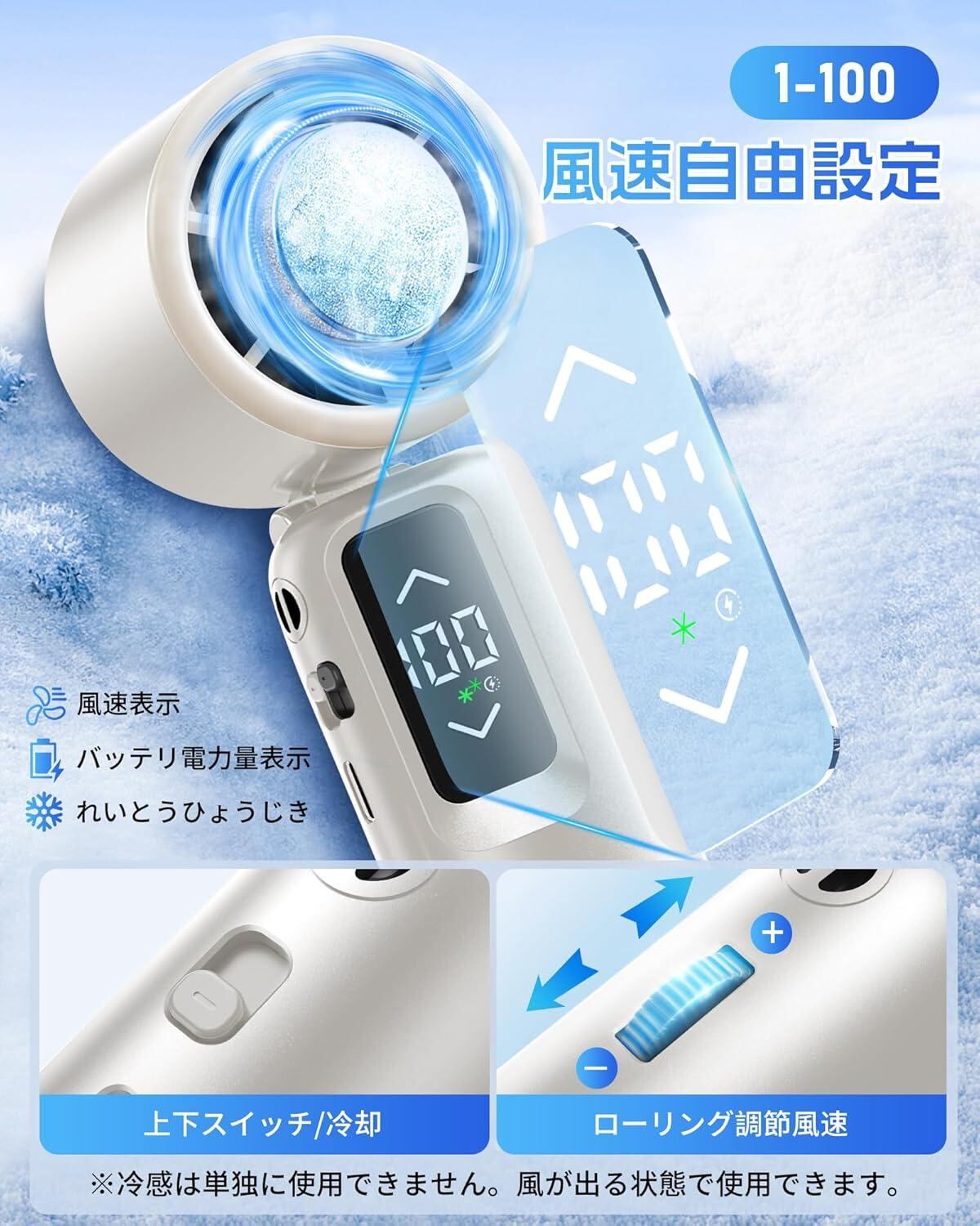 【1~100段階風量自由調節・7枚羽根】2025年進化版冷感扇風機は100段階の風量自由調整に対応しており、ダイヤルをスライドするだけで状況に応じた風量を細かく設定できます、自然に近い優しい風からパワフルな超強風まで細かく切り替えることが可能。7枚羽根の特殊設計により、一般的な3枚、5枚羽根の手持ち扇風機と比べて風のムラを大幅に減らし、より穏やかなバワフル風量を送ることが可能です、静音性にも優れている。冷却機能と併用するとさらに涼しく、汗による不快感を爽やかに変えて、暑苦しい夏でも快適に過ごせます。