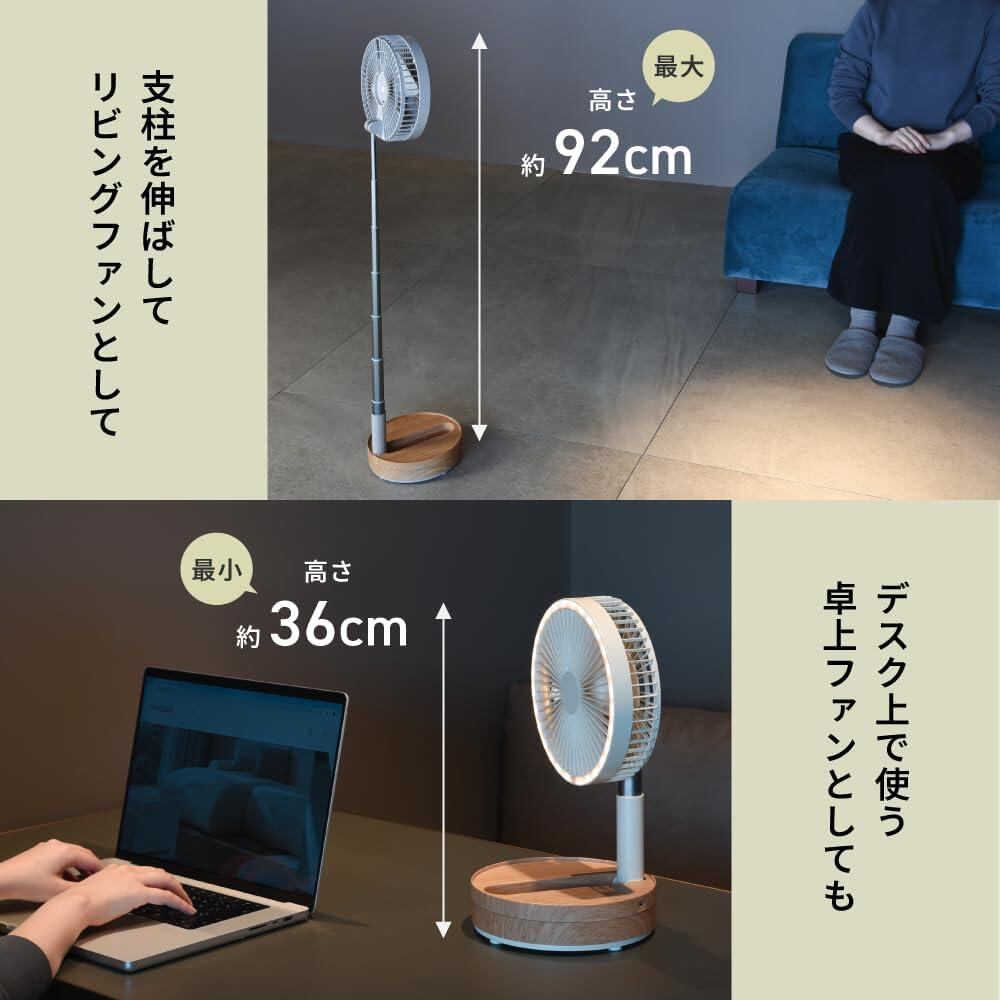 扇風機とLEDライトを融合し、卓上でデスクファンとしても、床置きでリビングファンとしても使用できる伸縮自在の充電式マルチフォールディングファン。コードレスでどこでも自由に持ち運ぶことができ、リビングやキッチン、デスクなど使用シーンに合わせてマルチな使い方ができます。
