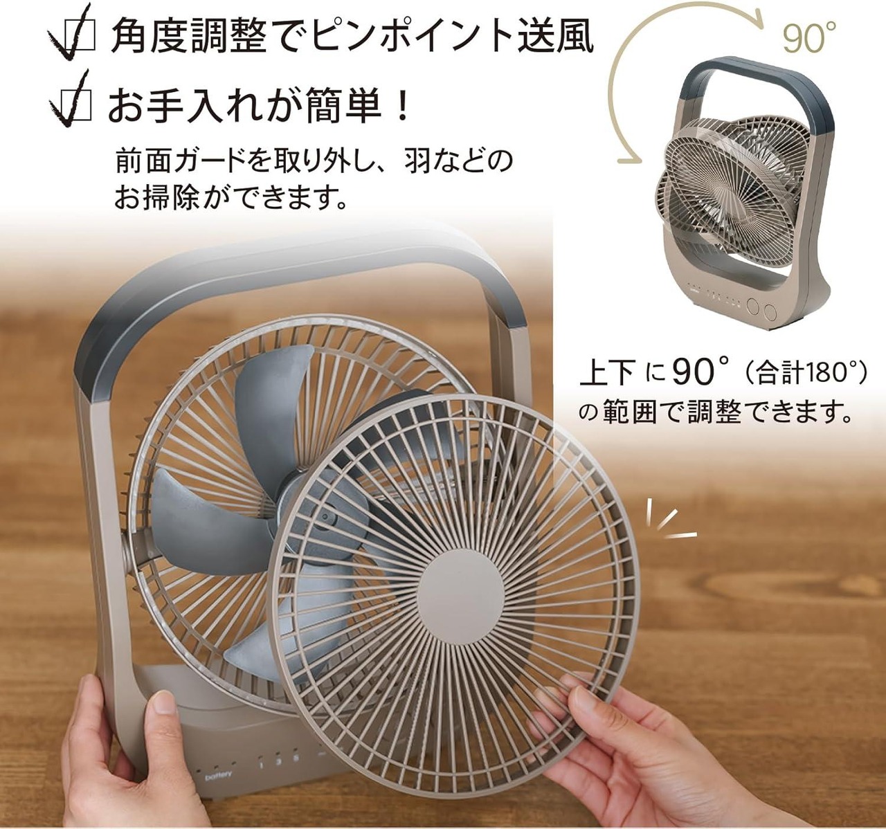 【充電式コードレス扇風機】インドアでもアウトドアでも使える程よいサイズの充電式コードレスタイプです。2025年製より電源がUSB Type-C化になり使いやすくなりました。スマートフォンの充電器を使って扇風機を充電できます。
