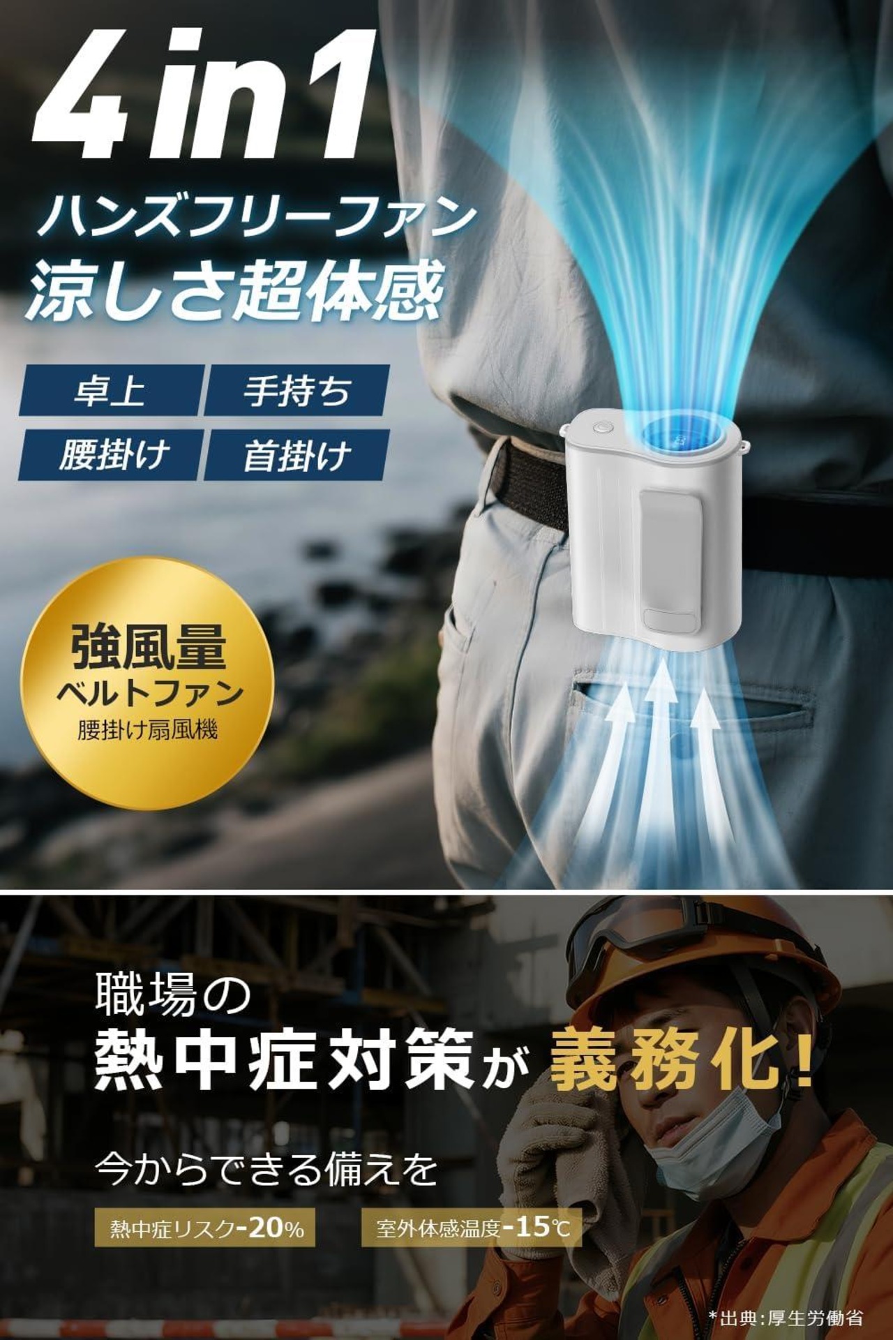【4way腰掛けファン・一台多役に使用可能】①腰掛け扇風機:クリップ付きでズボンやベルトにかけて服内に送風。上下逆方向のダブルクリップ機構によって、ズレや落下しにくい強力固定が可能、屋外作業に最適な熱中症対策グッズです。②首掛け扇風機:付属ネックストラップをつけて首にかけると、顔や首周りに涼しい風を届けます。③卓上扇風機:卓上に置いて、デスクワークの暑さ対策に適用。④手持ち扇風機:手に持って自由に風をあびて、さまざまなシーンで快適に使用できます。