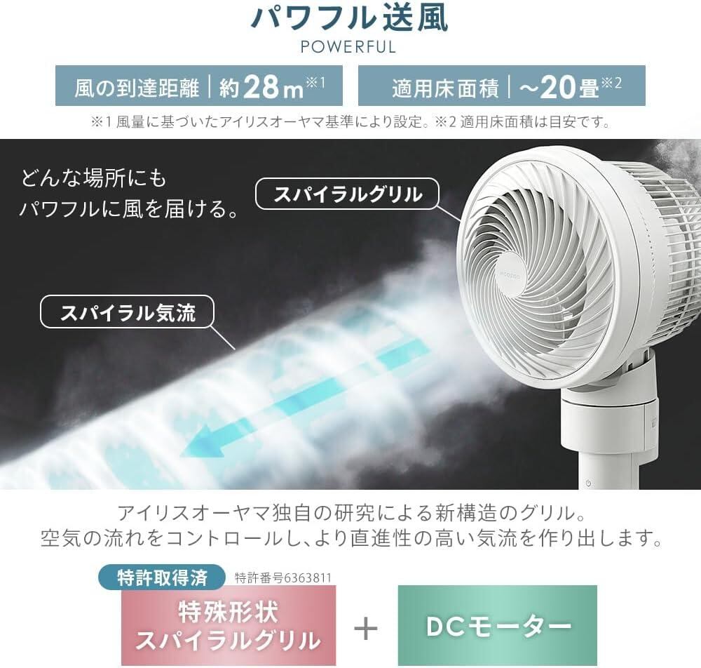 【パワフル送風】アイリスオーヤマ独自の研究による、新構造の特殊形状スパイラルグリル特許取得済特許番号:6363811。空気の流れをコントロールし、より直進性の高い気流を作り出す。さらにDCモーターを搭載することで、よりパワフルに。【あらゆる角度に送風】上下と左右の自動首振りを組み合わせることで、空気を立体的に撹拌できる。