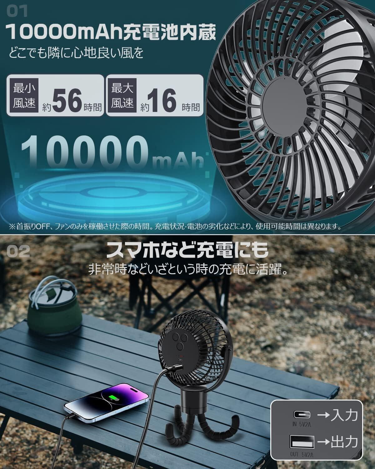 【10000mAh充電池内蔵&どこでも涼しい】大容量10000mAhのリチウムイオンポリマー電池を内蔵しています。フル充電の場合、最小モードで約56時間の連続使用ができます。長時間の外出時も快適にお過ごしいただけます。変幻自在のフレキシブルアームで、使う場所にぴったりのカタチを作る3WAYポータブルファンです。「巻く」「吊るす」「置く」3つの使い方ができ、屋内外問わず様々なシーンで活躍いたします。