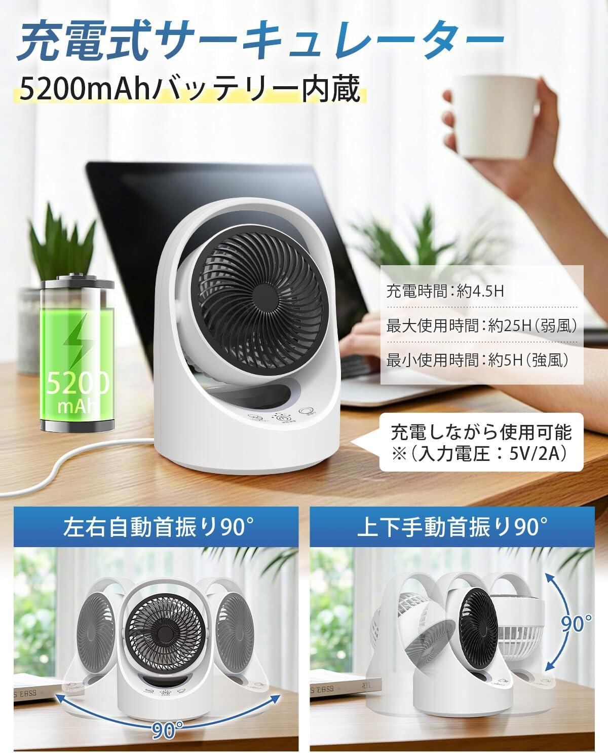 サーキュレーター DCモーター 扇風機 兼用 静音 USB【節電対策&最大26時間運転】コードレス 充電式 5200mAh パワフル送風 5段階風量調節 左右首振り 上下角度調節 1-7時間切タイマー