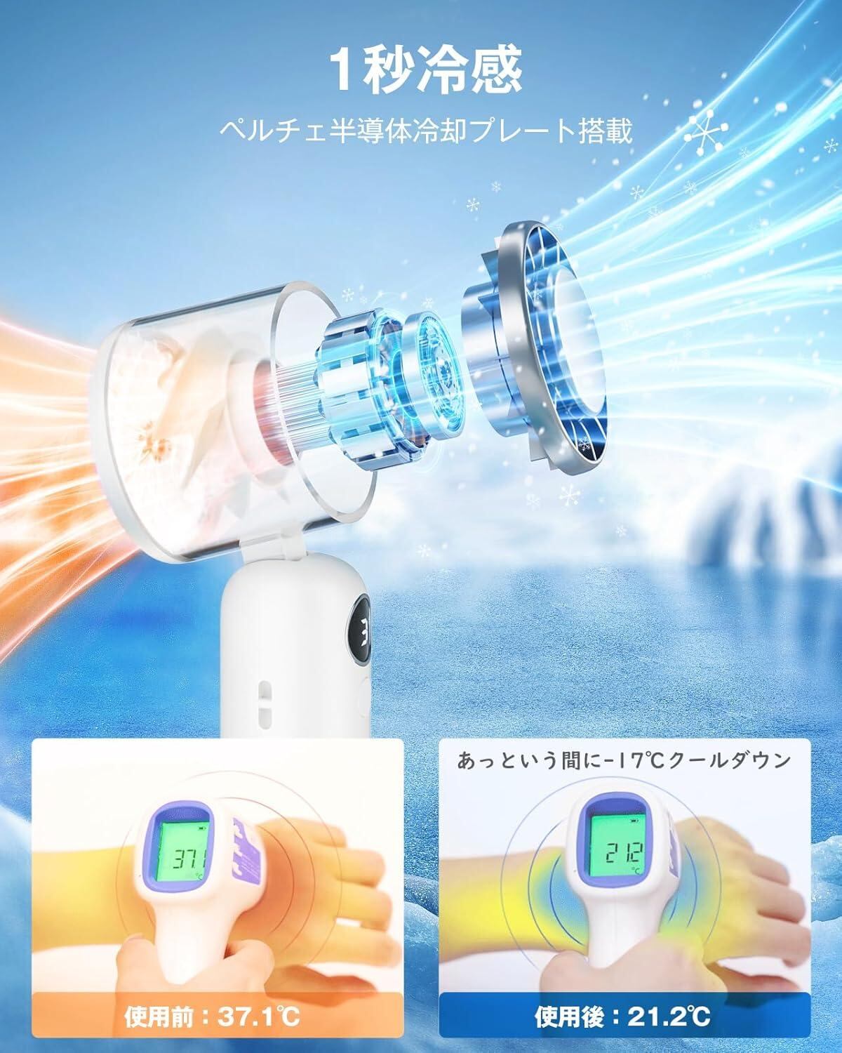 【1秒で冷感!冷却プレート付きハンディファン】❄️この新登場の冷却プレート付き扇風機は、氷のような触感を実現します。ペルチェ式の冷却プレートを首や手首などに当てるだけで、真夏日でも汗が吹き出してもすぐにリフレッシュ!汗をかいたらファンの風で涼しさを感じることができます。冷却グッズとして活用でき、熱中症対策にも最適です。
