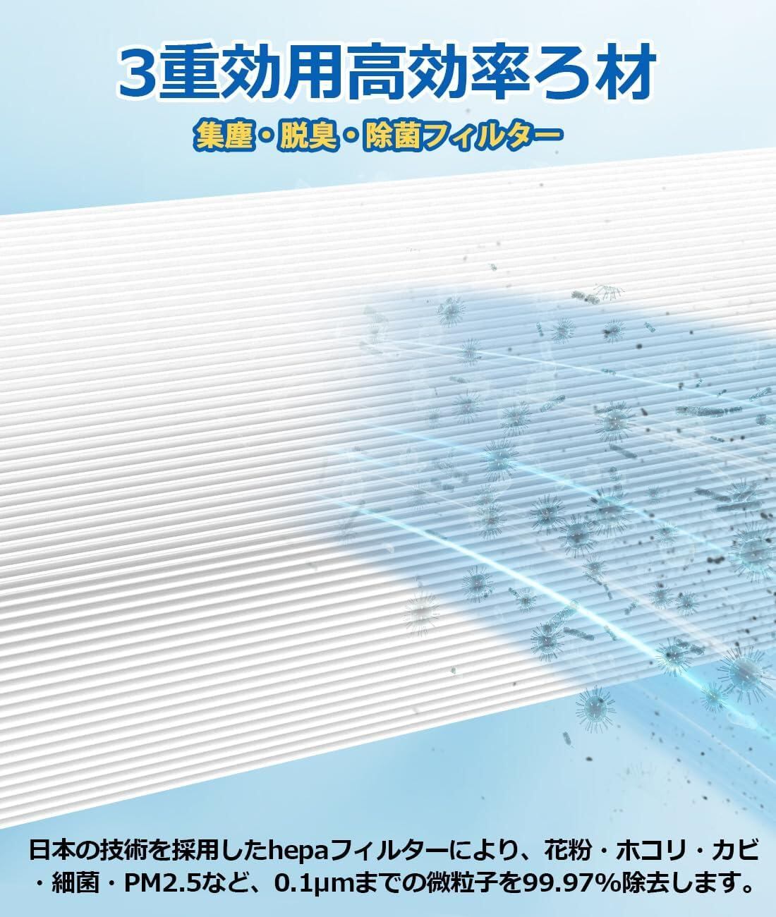 【素材が厳しい】HEPAマイクログラスファイバーをプリーツ状に折った⾼密度のフィルターです。超細いガラス繊維HEPAフィルターがPM0.1レベルの微細な粒子を99.97%除去し、花粉だけでなく、カビ胞子、バクテリアなども逃さない。